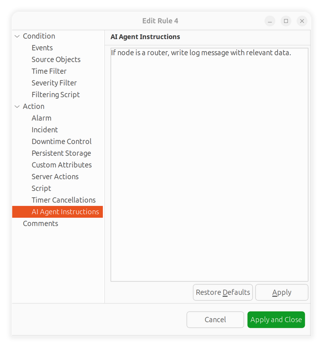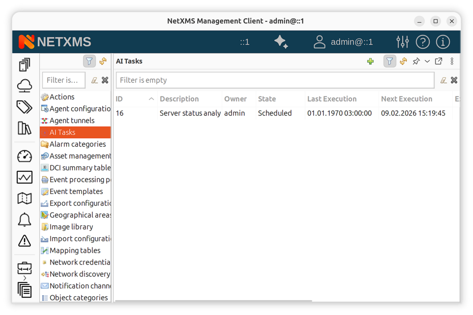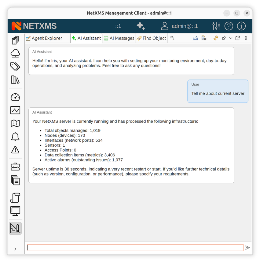 NetXMS includes an integrated AI assistant that helps with network monitoring, incident analysis, log investigation, and day-to-day administration tasks. The AI assistant connects to large language models (LLMs) and uses a set of built-in functions to query live NetXMS data, execute actions, and provide context-aware recommendations.